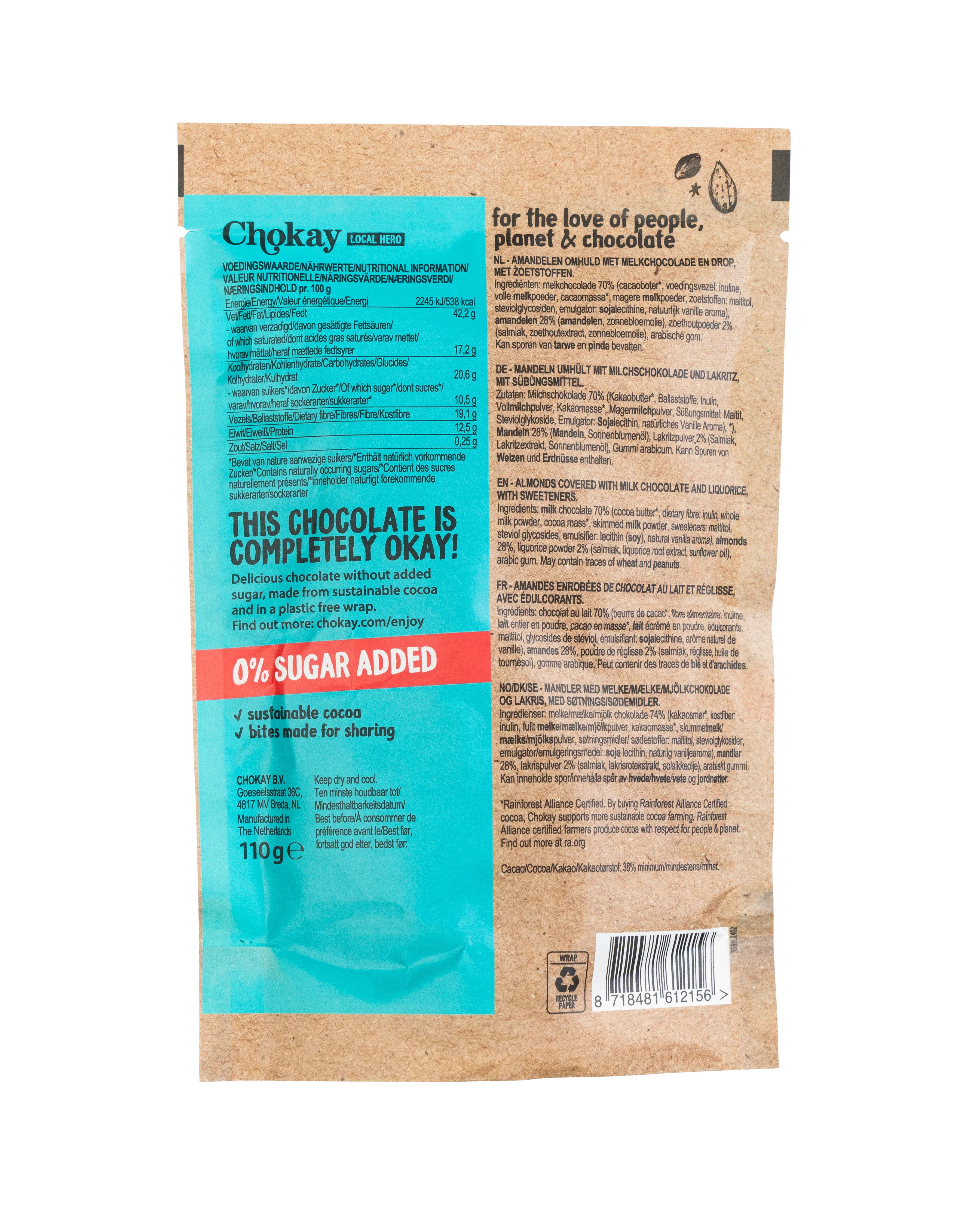 Salty lovers will enjoy this combination of a crunchy almond covered in Chokay milk chocolate and dusted with liquorice powder – no sugar added and quite addictive.